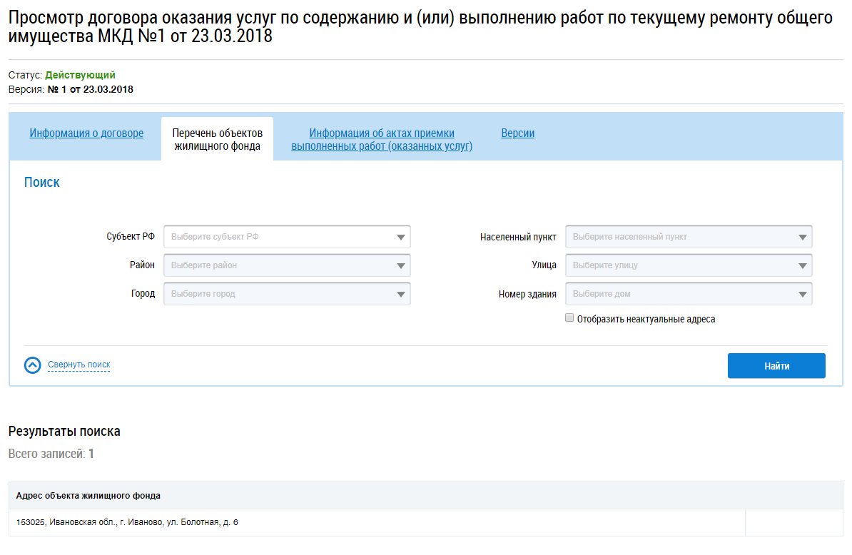 Для поиска объектов жилищного фонда последовательно установите параметры поиска, начиная с поля Субъект, и нажмите на кнопку Найти. Адреса объектов жилищного фонда, соответствующие введенным параметрам, отображаются в блоке Результаты поиска.