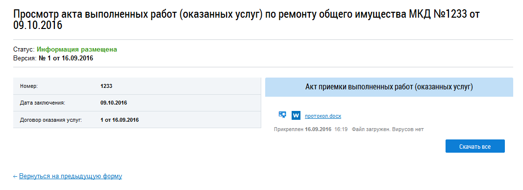 Отображается информация об акте выполненных работ. Чтобы скачать акт выполненных работ нажмите на гиперссылку с наименованием акта или на кнопку Скачать все.