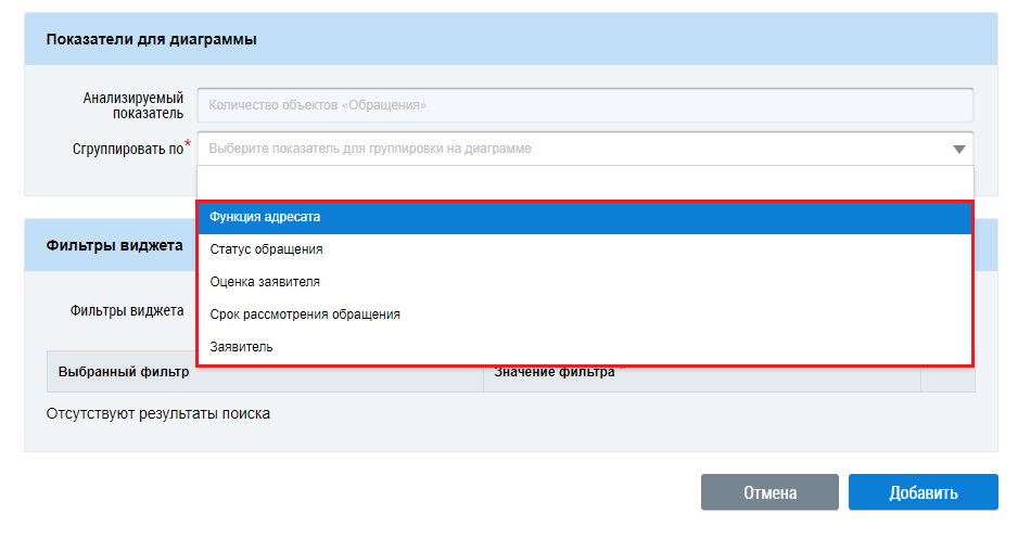Для добавления фильтра виджета выберите значения из выпадающего списка и нажмите на кнопку Добавить. Выбранные фильтры отображаются в блоке Фильтры виджета.