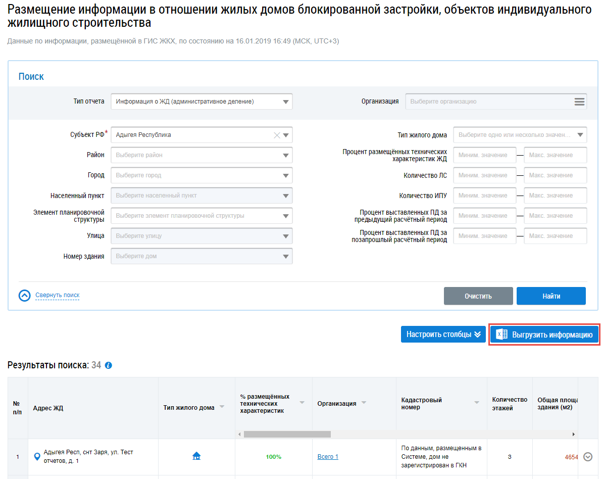 Чтобы выгрузить информацию по ЖД, нажмите на кнопку Выгрузить информацию на странице Размещение информации в отношении жилых домов блокированной застройки, объектов индивидуального жилищного строительства.