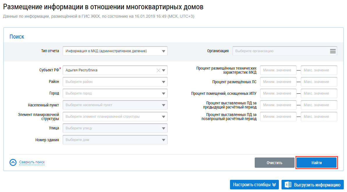 При выборе разных типов отчета отображаются различные поля поиска. Поиск отчетов по МКД возможен по одному или нескольким параметрам.