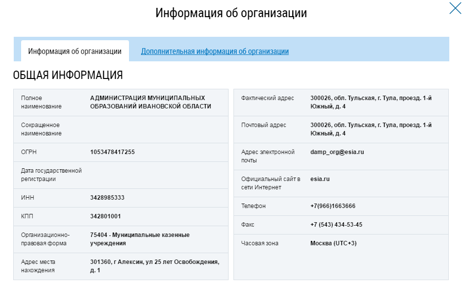 Нажмите на гиперссылку с наименованием организации. Отображается окно Информация об организации.