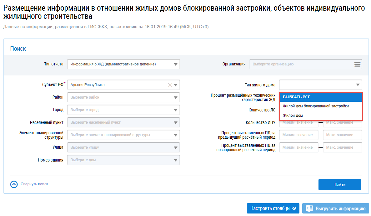 Для заполнения поля Тип жилого дома выберите значение из выпадающего списка.