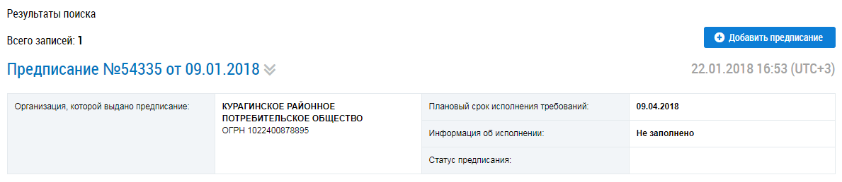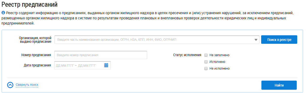 Для осуществления поиска по реестру предписаний задайте параметры поиска в блоке поиска. Чем конкретнее будет задан запрос, тем уже будет выборка результатов.