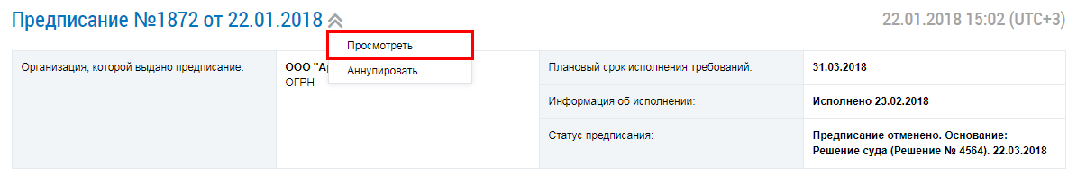 Для просмотра карточки предписания раскройте контекстное меню предписания и выберите пункт Просмотреть.
