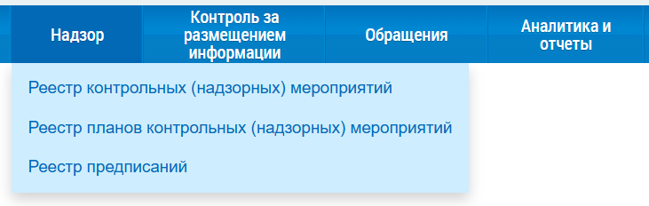 При нажатии на пункт горизонтального навигационного меню Надзор отображается контекстное меню раздела.