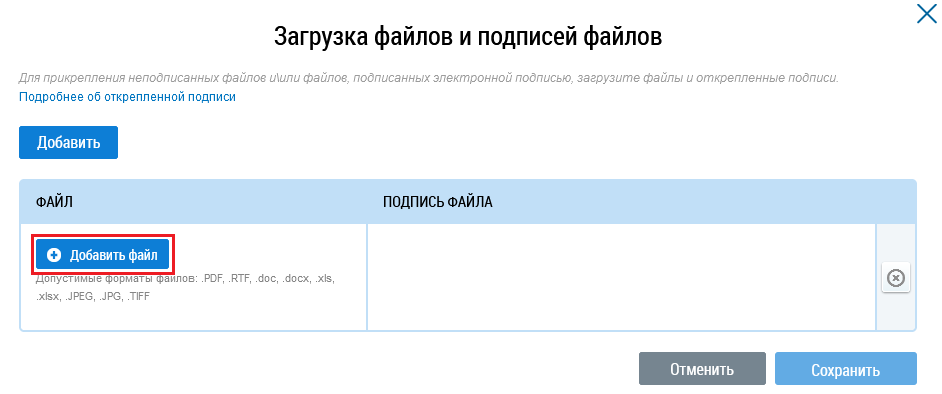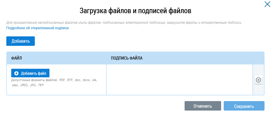 Выберите документ и дождитесь окончания его загрузки. После загрузки документа становится возможной загрузка электронной подписи. Нажмите на кнопку Добавить файл в столбце Подпись файла для прикрепления электронной подписи.