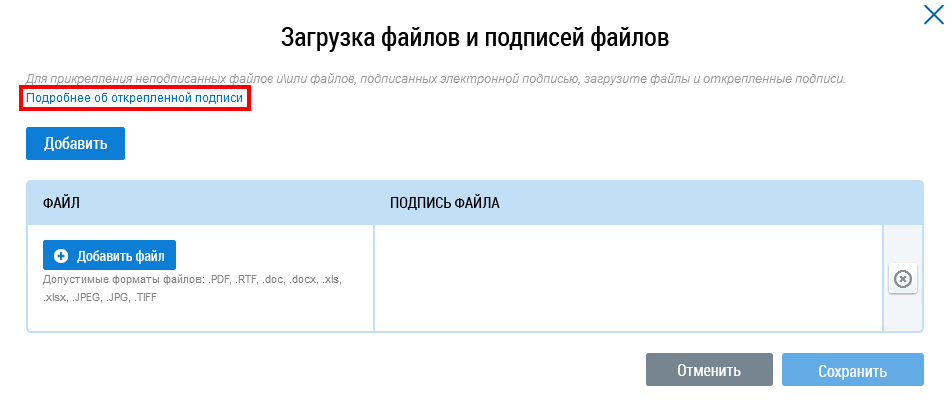 Для получения информации о работе с электронной подписью нажмите на ссылку Подробнее об открепленной подписи.