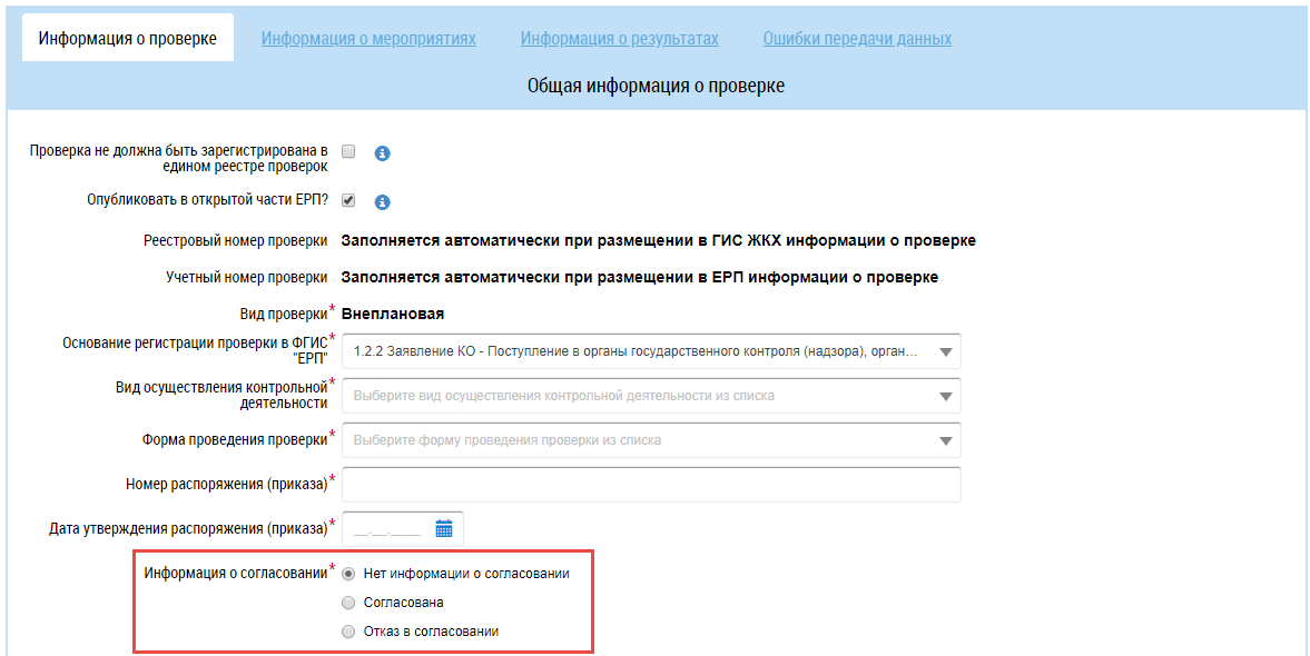 При выборе основания регистрации контрольного (надзорного) мероприятия в ФГИС «ЕРП» - Заявление КО, отображается дополнительное поле Информация о согласовании.