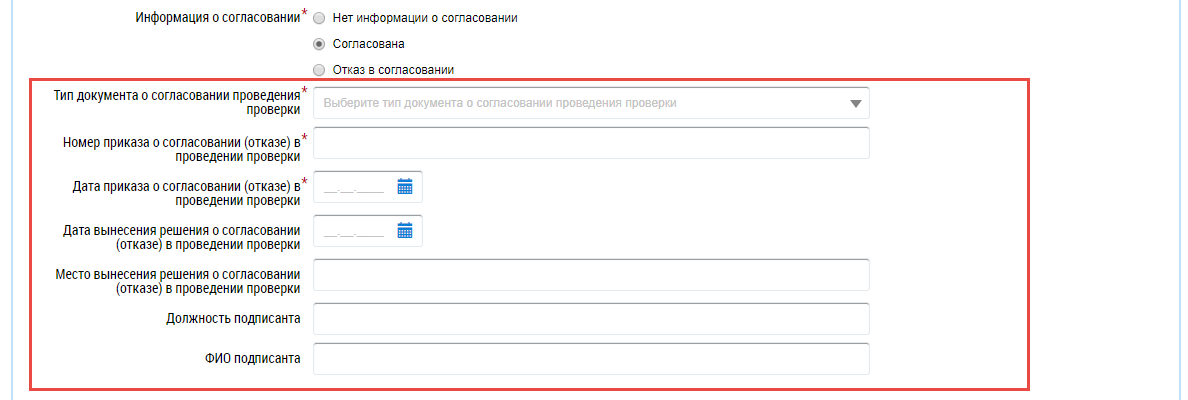 Введите значения в поля Номер приказа о согласовании (отказе) в проведении проверки и Дата приказа о согласовании (отказе) в проведении проверки, а также заполните остальные поля блока.