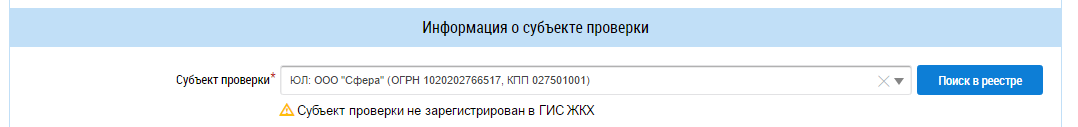 В блоке Информация о субъекте проверки заполните поле Субъект проверки, выбрав значение из выпадающего списка или нажав на кнопку Поиск в реестре и выбрав значение из справочника. В случае, если субъект проверки зарегистрирован/не зарегистрирован в ГИС ЖКХ, отображаются соответствующие сообщения.