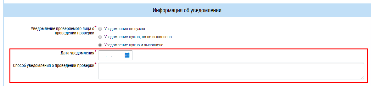 При установлении флажка в поле Уведомление нужно и выполнено поля Дата уведомления и Способ уведомления о проведении проверки становятся обязательными.
