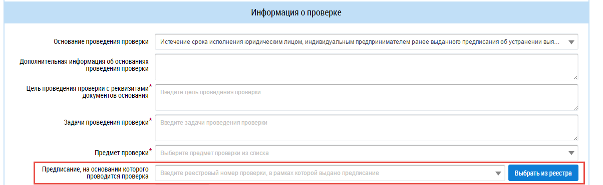 Если в качестве значения для поля Основание проведения проверки выбрано Истечение срока исполнения лицензиатом ранее выданного лицензирующим органом предписания об устранении выявленного нарушения лицензионных требований (вид осуществления контрольной деятельности – лицензионный контроль), Наличие ходатайства лицензиата о проведении лицензирующим органом внеплановой выездной проверки в целях установления факта досрочного исполнения предписания лицензирующего органа (вид осуществления контрольной деятельности - лицензионный контроль) или Истечение срока исполнения юридическим лицом, индивидуальным предпринимателем ранее выданного предписания об устранении выявленного нарушения обязательных требований и (или) требований, установленных муниципальными правовыми актами (вид осуществления контрольной деятельности - государственный и муниципальный жилищный надзор (контроль)), то отображается дополнительное поле Предписание, на основании которого проводится проверка.