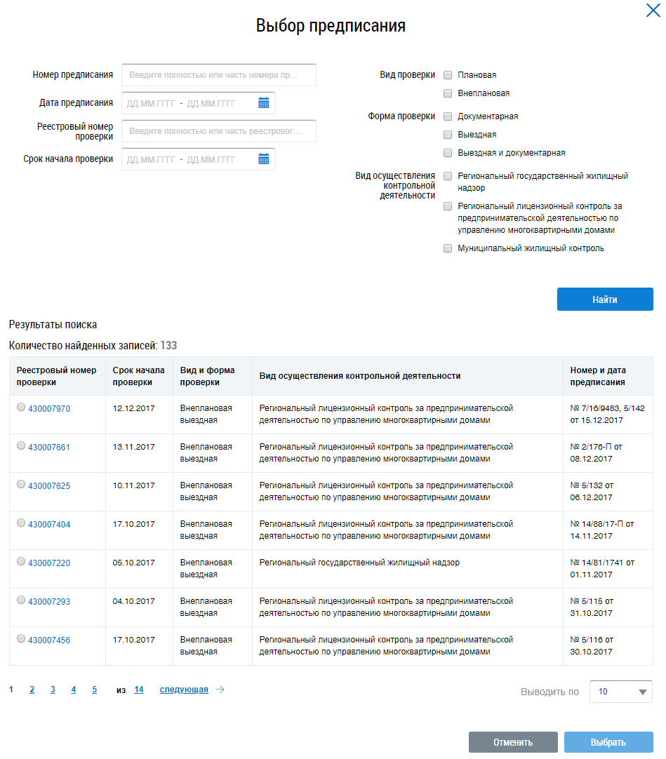 Установите параметры блока поиска и нажмите на кнопку Найти. Установите переключатель в поле необходимого предписания и нажмите на кнопку Выбрать.