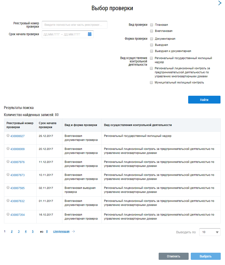 Установите параметры поиска и нажмите на кнопку Найти. Установите переключатель в поле необходимого контрольного (надзорного) мероприятия и нажмите на кнопку Выбрать.