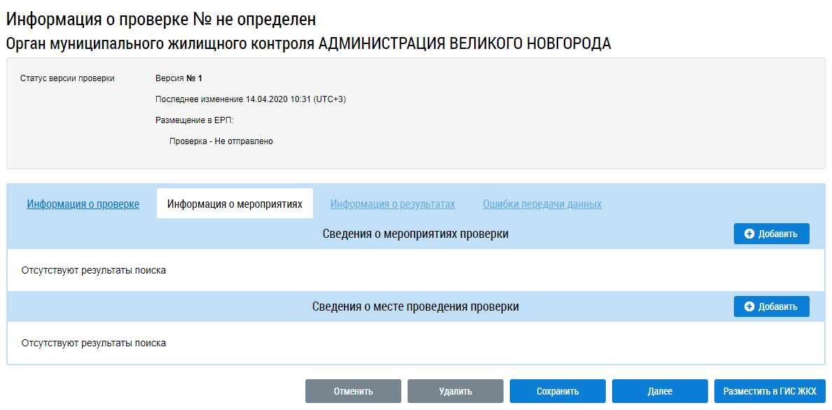 Для сохранения или размещения информации о контрольном (надзорном) мероприятии без перехода к добавлению информации о мероприятиях нажмите на кнопку Сохранить или Разместить в ГИС ЖКХ.