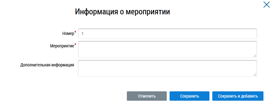 Для добавления информации о мероприятиях нажмите на кнопку Добавить в соответствующем информационном блоке. Отображается форма добавления информации о мероприятии. Заполните обязательные поля и нажмите на кнопку Сохранить. Для сохранения и перехода к добавлению следующего мероприятия нажмите на кнопку Сохранить и добавить.