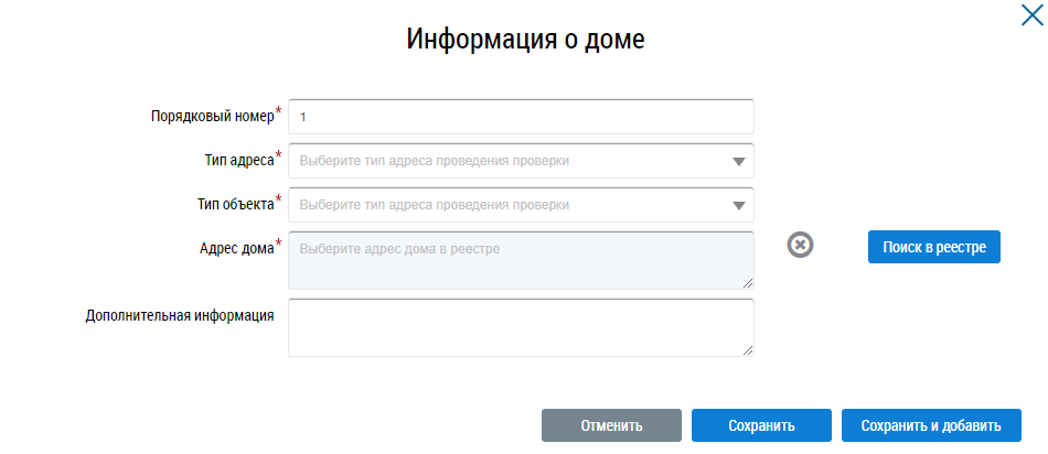 Для добавления информации о месте проведения контрольного (надзорного) мероприятия нажмите на кнопку Добавить в соответствующем информационном блоке. В отобразившейся форме заполните обязательные поля.