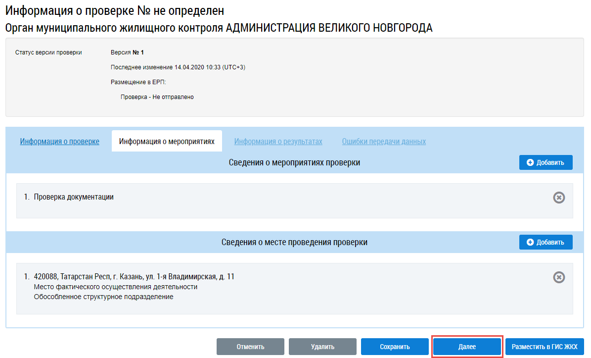 При необходимости добавления информации о результатах контрольного (надзорного) мероприятия нажмите на кнопку Далее.