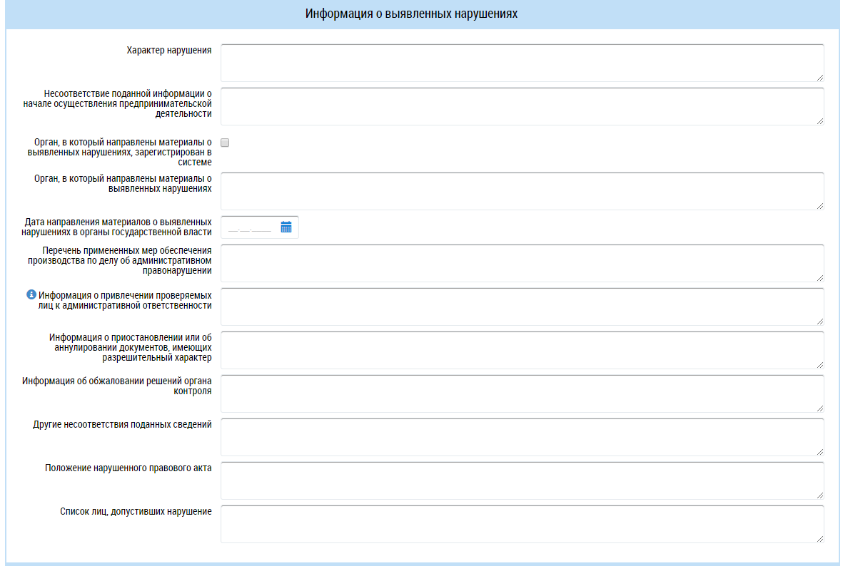 При наличии подробной информации о выявленных нарушениях, необходимо ввести ее в соответствующие поля блока Информация о выявленных нарушениях.