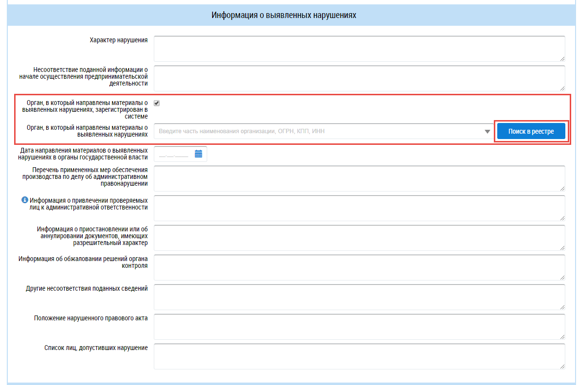 Для добавления информации об органе, в который направлены материалы о выявленных нарушениях, введите значение вручную в соответствующее поле или установите флажок в поле Орган, в который направлены материалы о выявленных нарушениях, зарегистрирован в системе. В поле Орган, в который направлены материалы о выявленных нарушениях отображается кнопка Поиск в реестре.