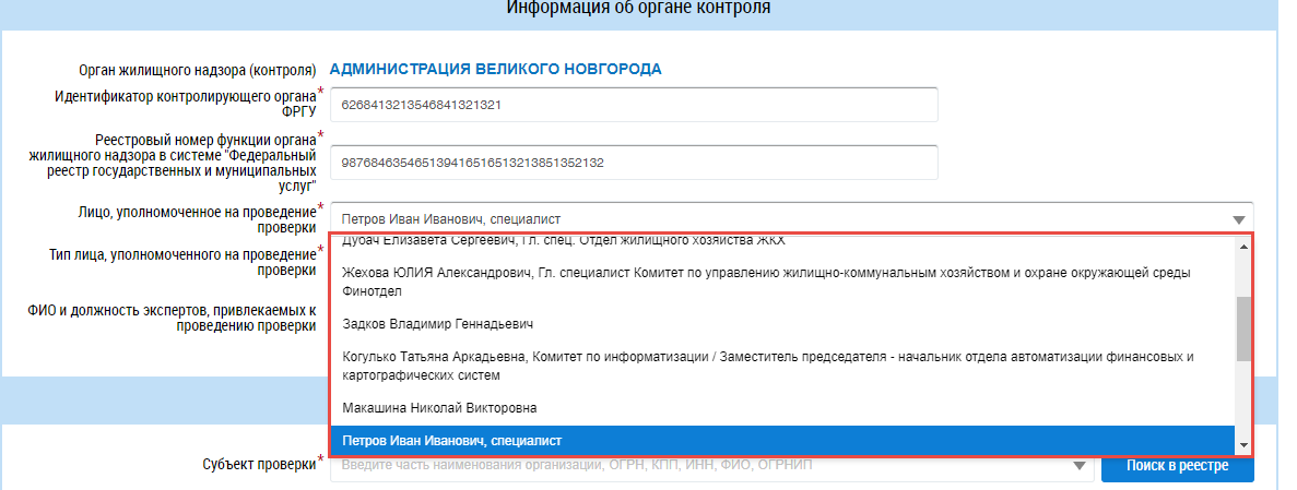 Для заполнения обязательного поля Лицо, уполномоченное на проведение проверки выберите значение из выпадающего списка.