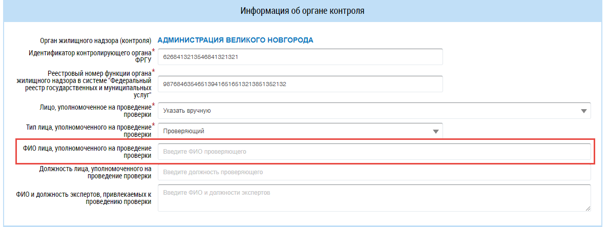 В случае выбора варианта Указать вручную отображается дополнительное поле ФИО лица, уполномоченного на проведение проверки.