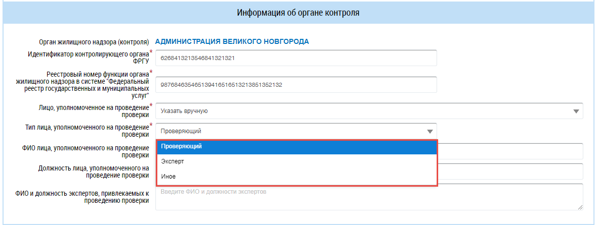 Для заполнения поля Тип лица, уполномоченного на проведение проверки выберите значение из выпадающего списка.