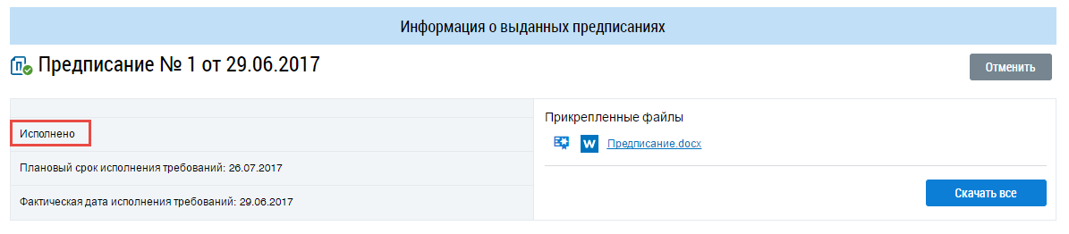 Нажмите на кнопку Отметить предписание как исполненное. Отображается окно Информация о выданном предписании.