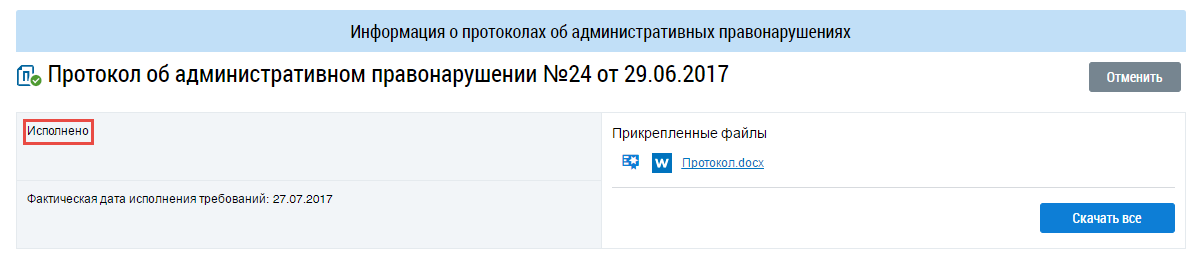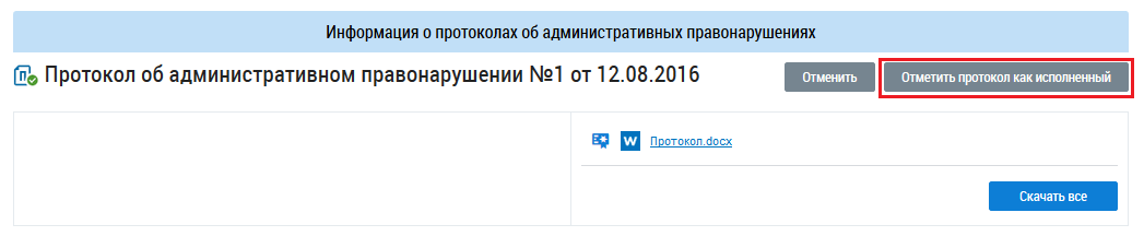 Для размещения информации об исполнении протокола о правонарушениях в соответствующем блоке нажмите на кнопку Отметить протокол как исполненный.