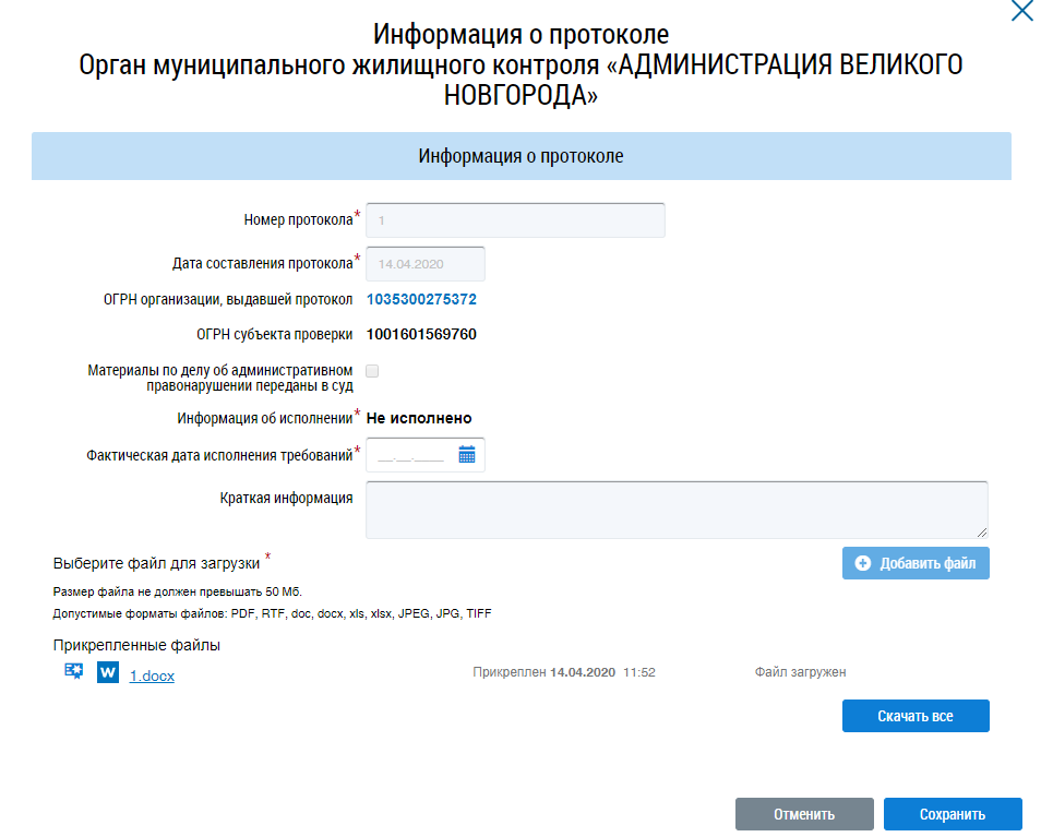 Размещение информации об исполнении предписаний и протоколов контрольного (надзорного) мероприятия
