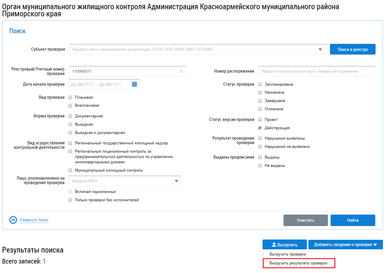 Для экспорта результатов плановых контрольных (надзорных) мероприятий за определенный период нажмите на кнопку Выгрузить и выберите пункт контекстного меню Выгрузить результаты проверок.