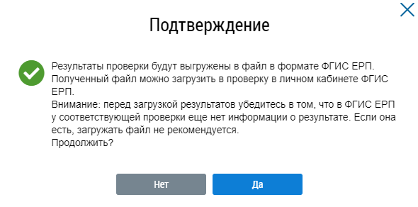 Убедитесь, что в ФГИС ЕРП у соответствующего контрольного (надзорного) мероприятия еще нет информации о результате и нажмите на кнопку Да. Для отмены действия – Нет.