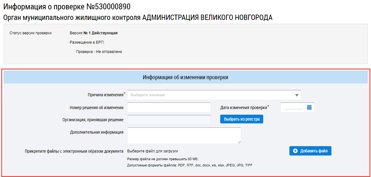 Для заполнения поля Причина изменения выберите значение из выпадающего списка. Внесите информацию в поля Номер решения об изменении и Дата изменения проверки. Для выбора организации, принявшей решение, нажмите на кнопку Выбрать из реестра. При необходимости заполните поле Дополнительная информация и прикрепите файлы с электронным образом документа, нажав на кнопку Добавить файл.