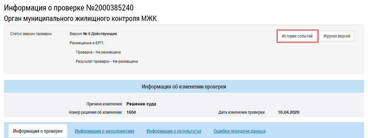 Для просмотра истории изменения контрольного (надзорного) мероприятия перейдите в карточку контрольного (надзорного) мероприятия и в верхней части страницы нажмите на кнопку История событий.