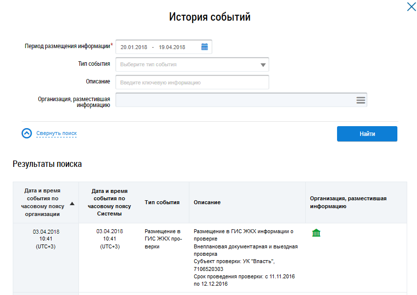 Для поиска по истории событий установите необходимые параметры поиска и нажмите на кнопку Найти.