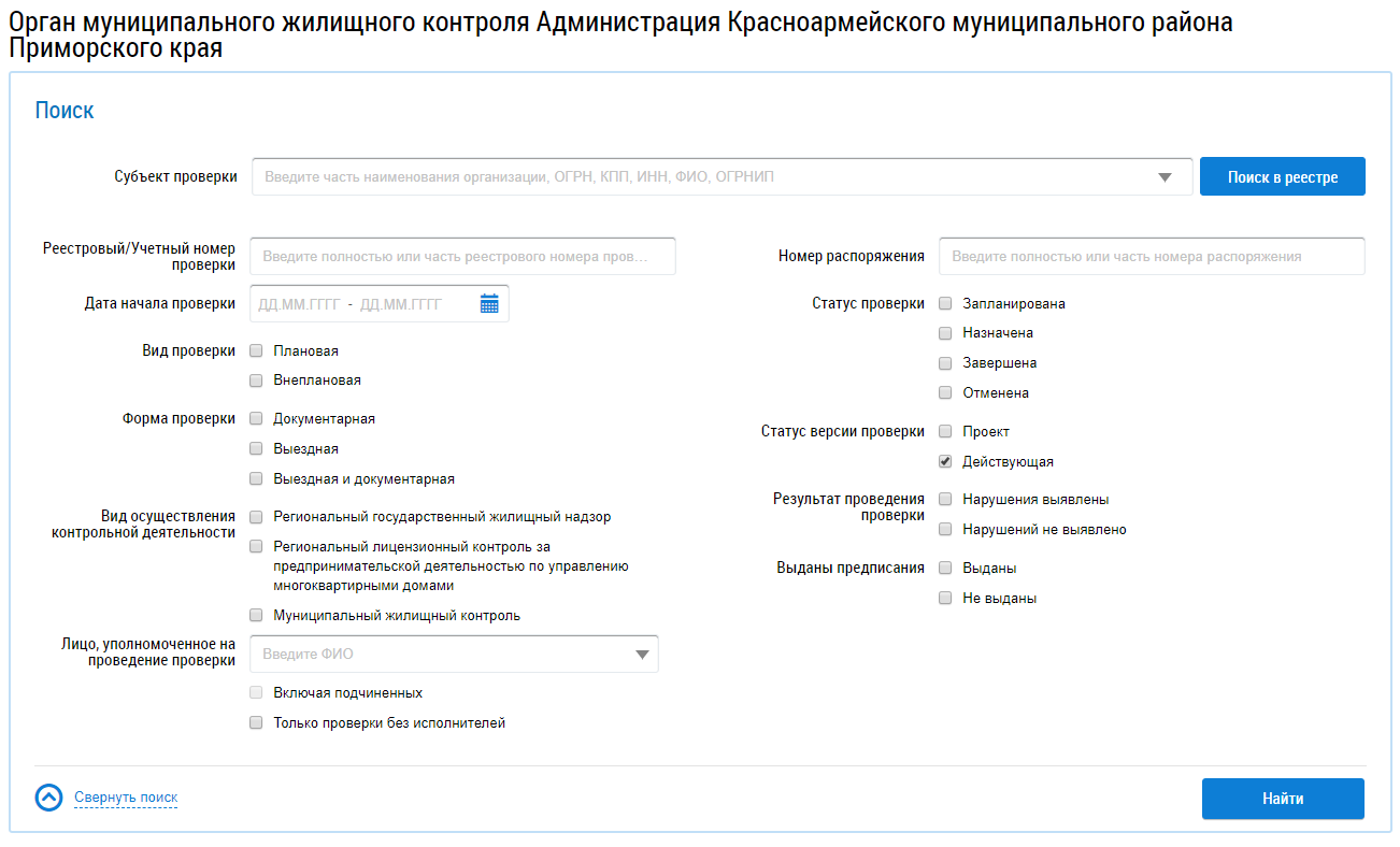 Для осуществления поиска информации о контрольных (надзорных) мероприятиях заполните одно или несколько полей блока поиска и нажмите на кнопку Найти. Чем точнее будут заданы критерии поиска, тем уже будет выборка результатов.