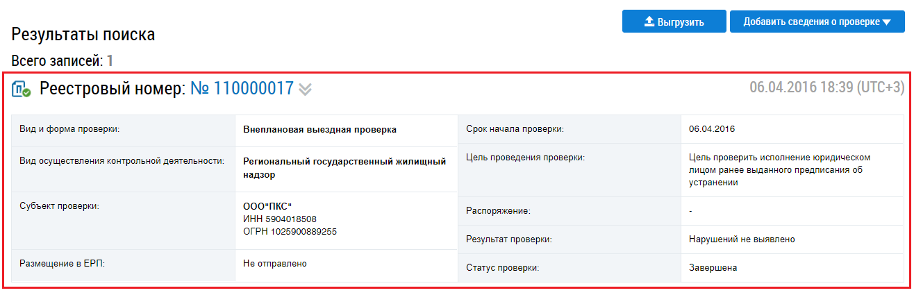 Для заполнения поля Субъект проверки нажмите на кнопку Поиск в реестре и выберите юридическое лицо или ИП из справочника.