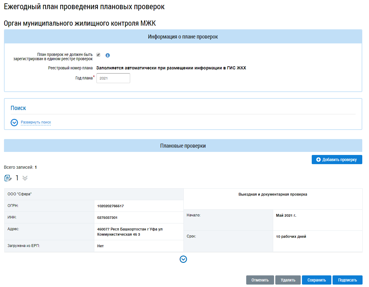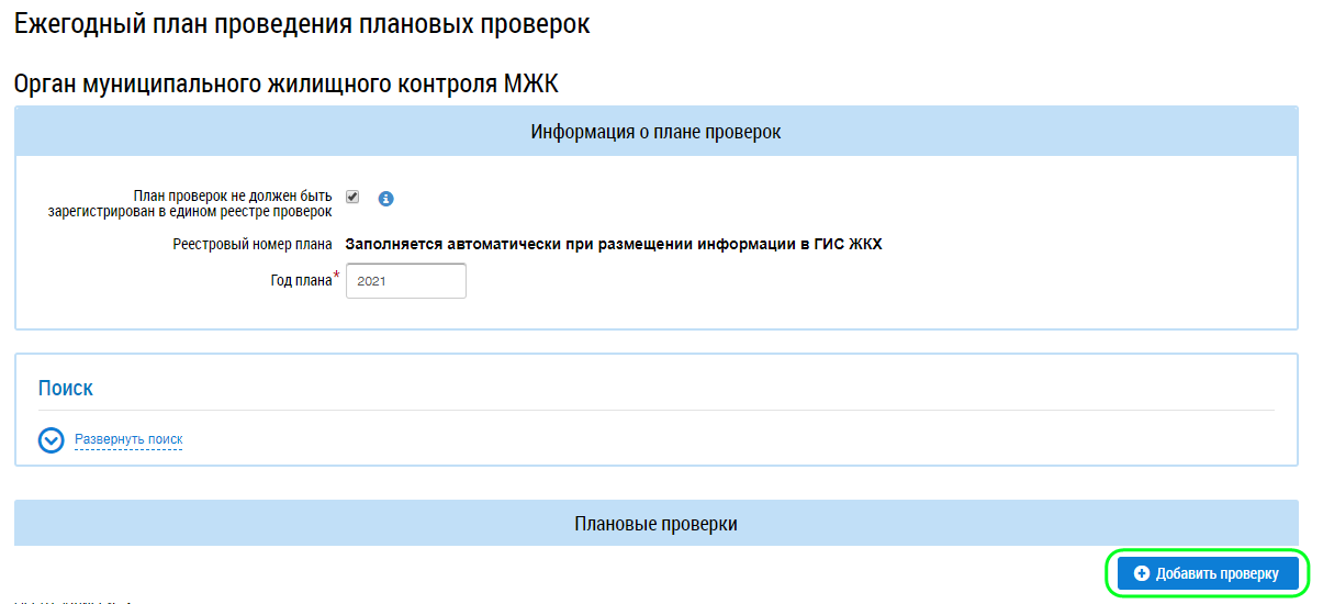 Для добавления планового контрольного (надзорного) мероприятия в план нажмите на кнопку Добавить проверку.
