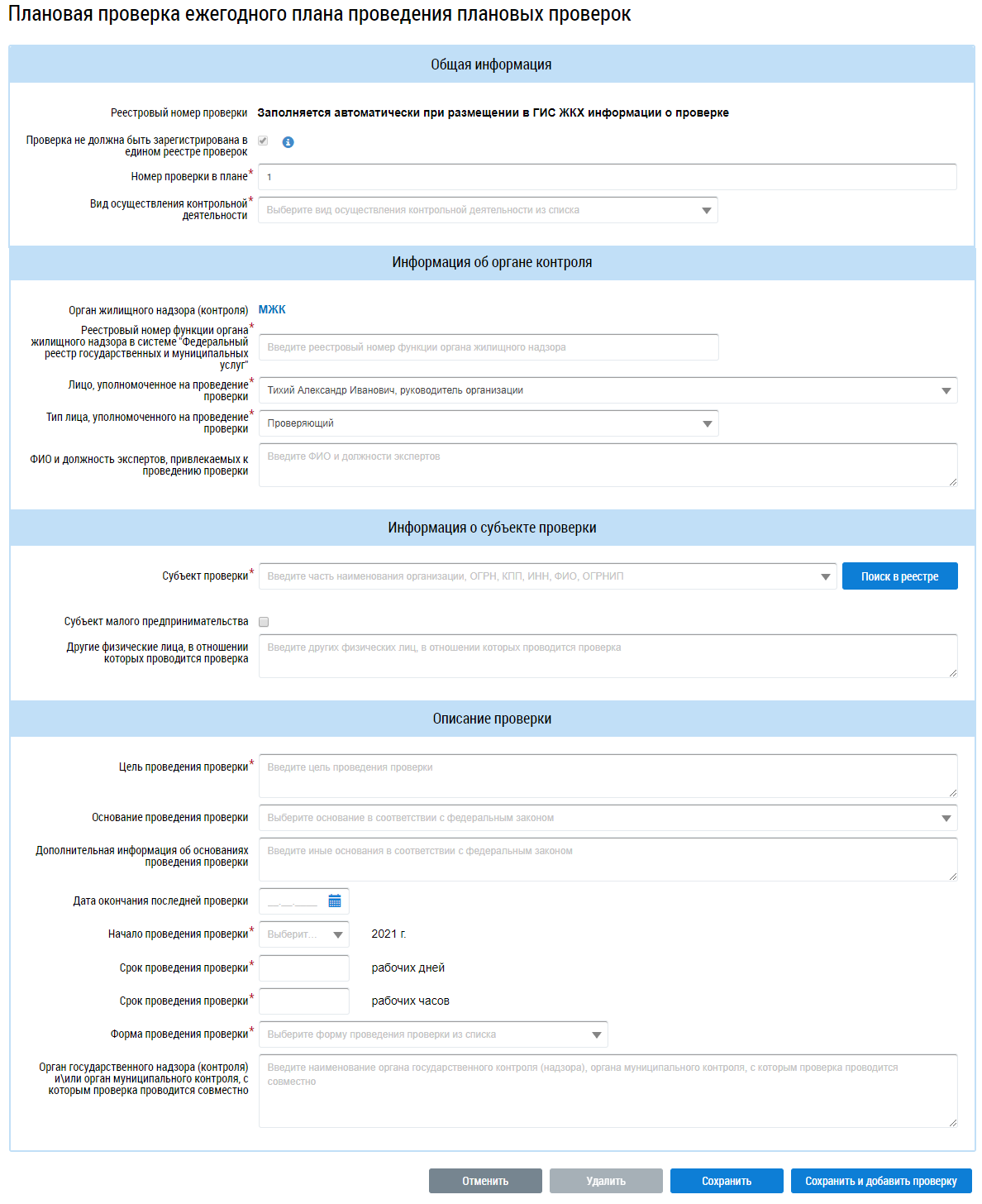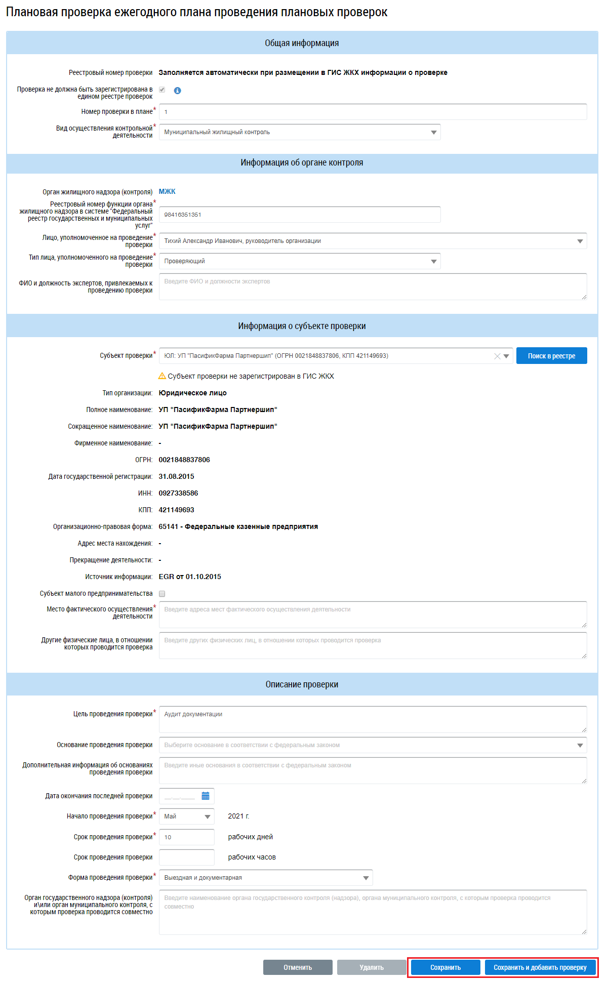 Проверьте корректность введенных данных. Чтобы сохранить контрольное (надзорное) мероприятие и добавить новое, нажмите на кнопку Сохранить и добавить проверку на форме добавления планового контрольного (надзорного) мероприятия. Чтобы сохранить контрольное (надзорное) мероприятие и вернуться к странице формирования плана контрольных (надзорных) мероприятий, нажмите на кнопку Сохранить.
