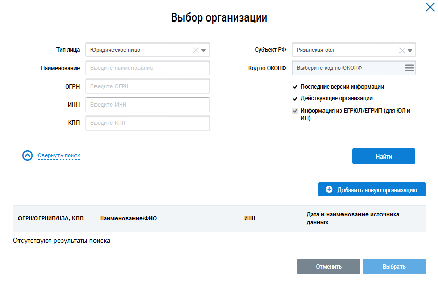 Установите необходимые параметры поиска и нажмите на кнопку Найти. В результатах поиска установите переключатель в поле необходимой организации и нажмите на кнопку Выбрать.