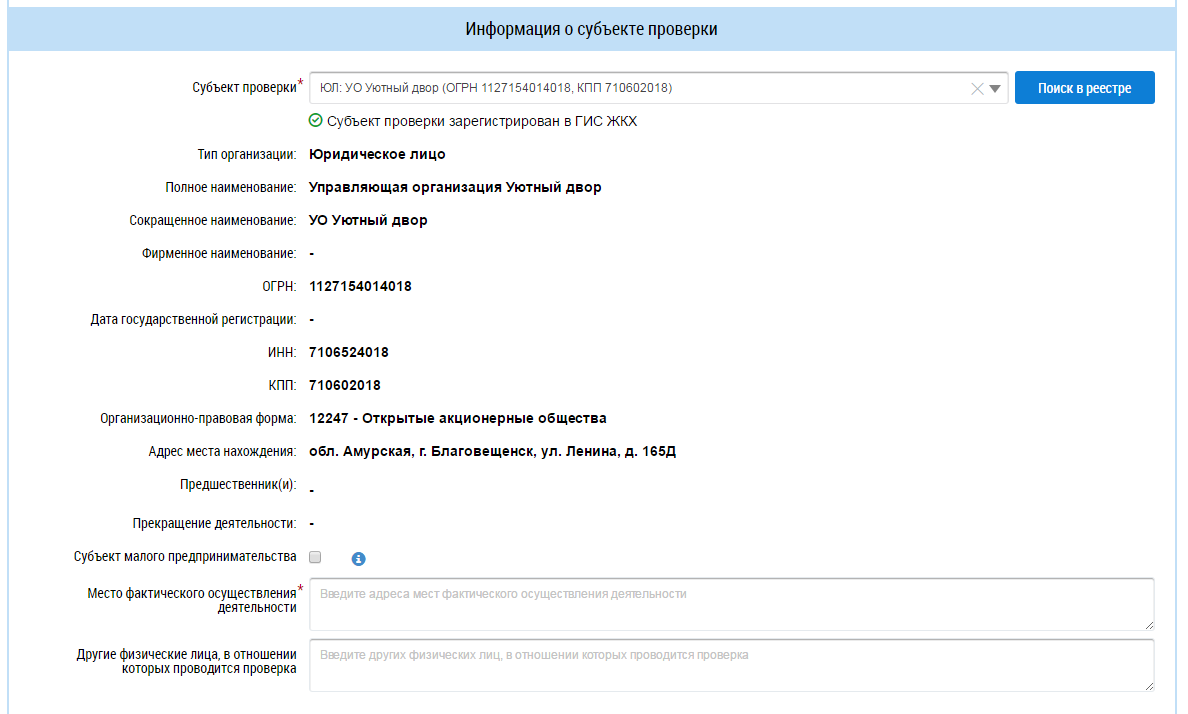 Информация о субъекте проверки отображается в соответствующем блоке.