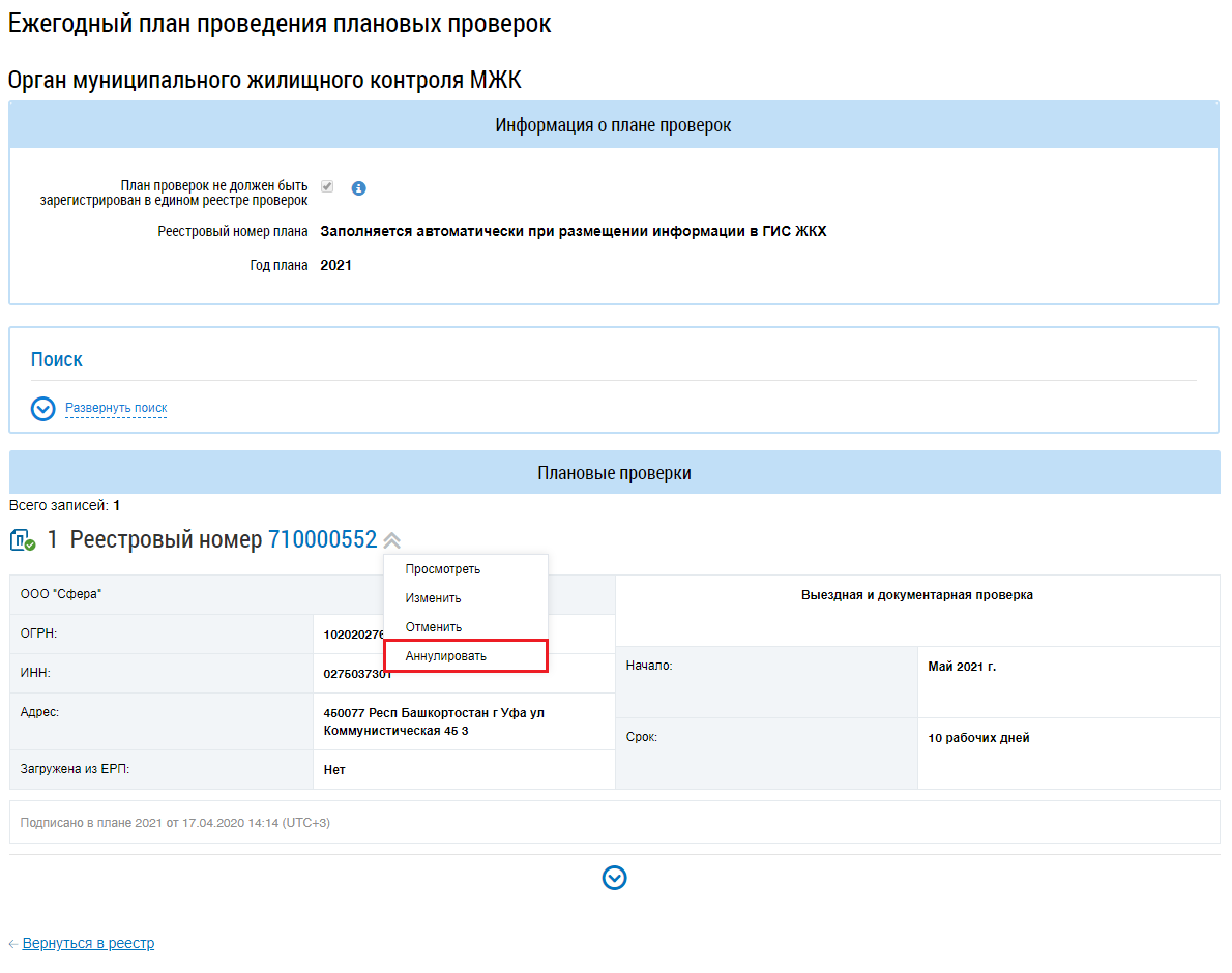 Аннулирование контрольного (надзорного) мероприятия в плане контрольных (надзорных) мероприятий