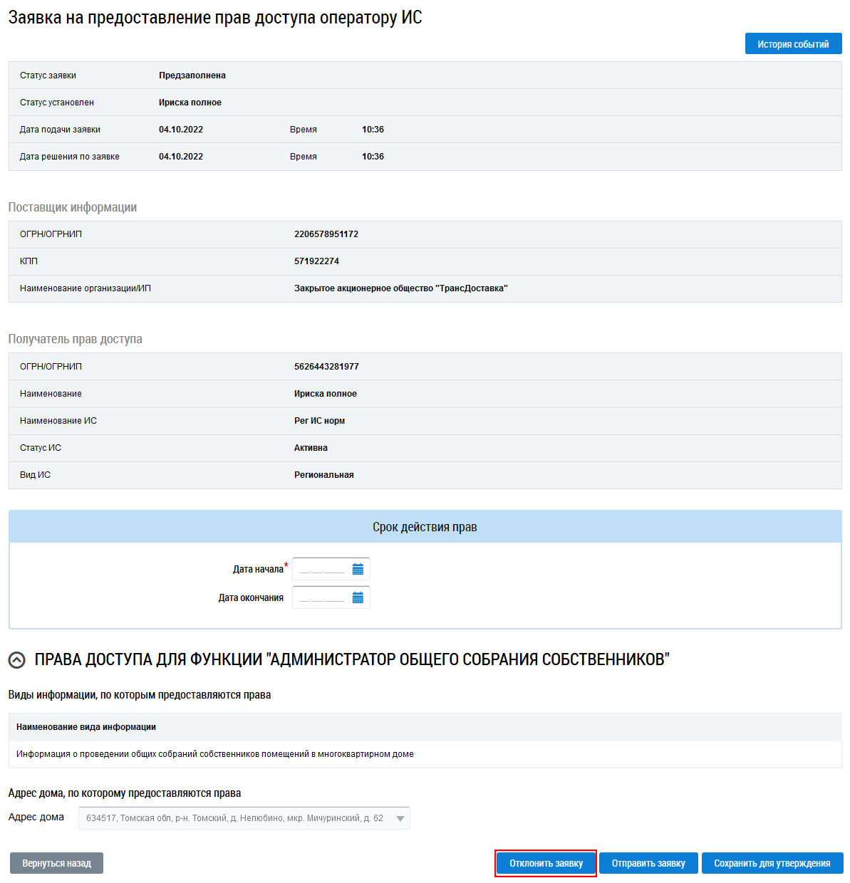 Операция отклонения заявки доступна руководителю организации для заявок в статусе На утверждении и Предзаполнена.