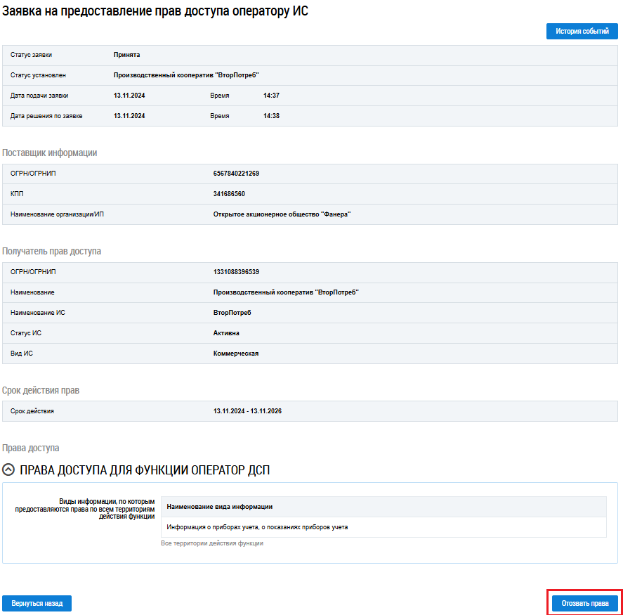Операция отзыва прав доступа доступна для заявок в статусе Принята.