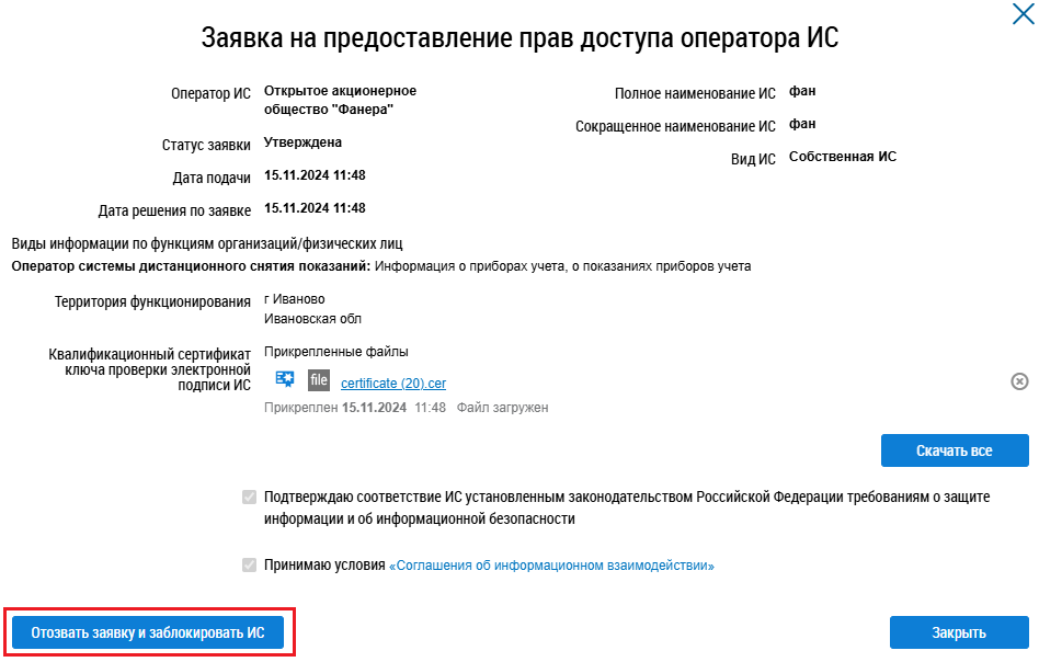 Система предоставляет возможность отозвать заявку и сразу заблокировать информационную систему. Операция отзыва заявки и блокировки ИС доступна для ИС в статусе Активна.