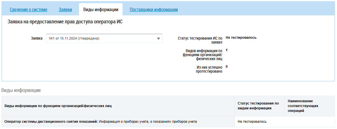 Вкладка Виды информации содержит сведения о тестировании ИС и результатах тестирования, если была подана заявка на тестирование. Для просмотра результатов тестирования определенной заявки выберите в выпадающем списке поля Заявка необходимое значение.
