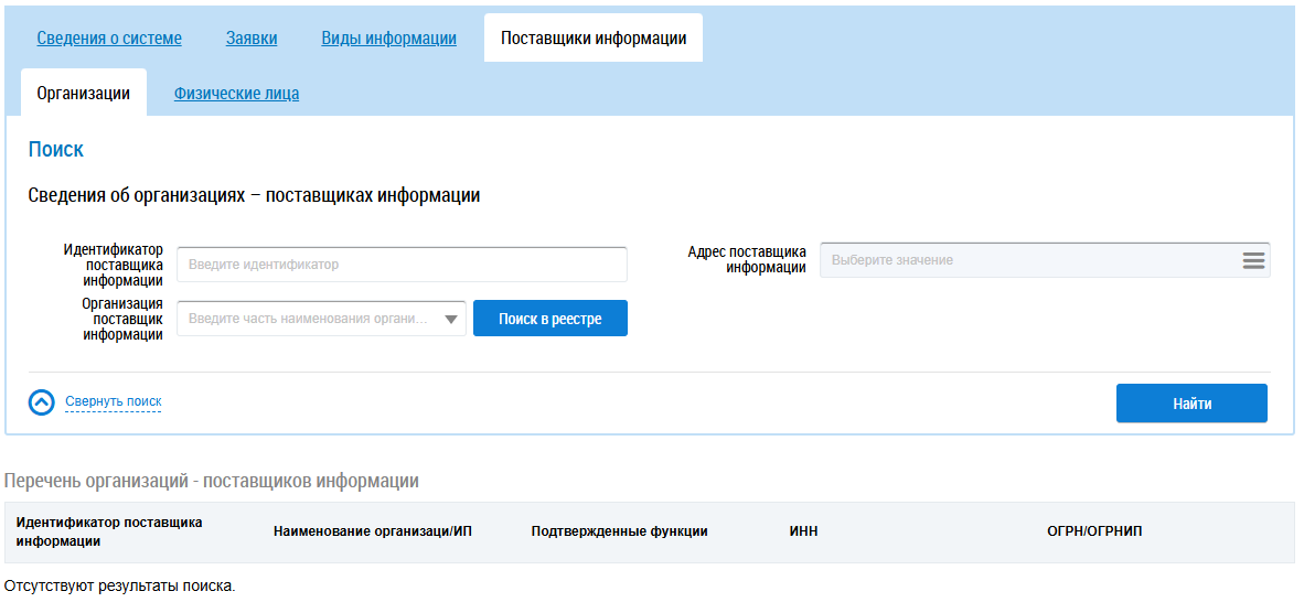 В случае необходимости воспользуйтесь блоком поиска организации. Установите необходимые параметры поиска и нажмите на кнопку Найти. В блоке Перечень организаций-поставщиков информации отобразятся организации, соответствующие поисковому запросу.