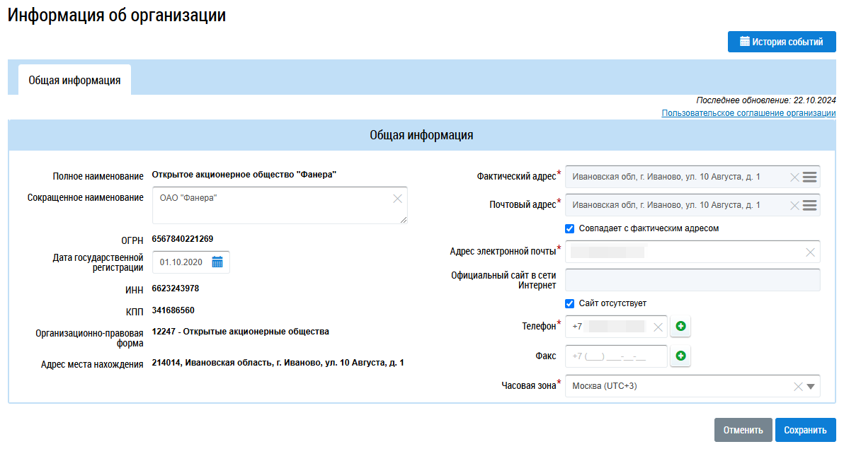Часть полей на вкладке Общая информация заполнена данными, указанными при регистрации организации в ЕСИА. К этим полям относятся: