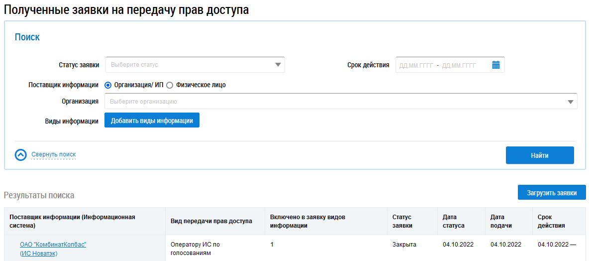 В данном разделе отображаются заявки на предоставление прав доступа, поступившие Оператору ИС от поставщиков информации.